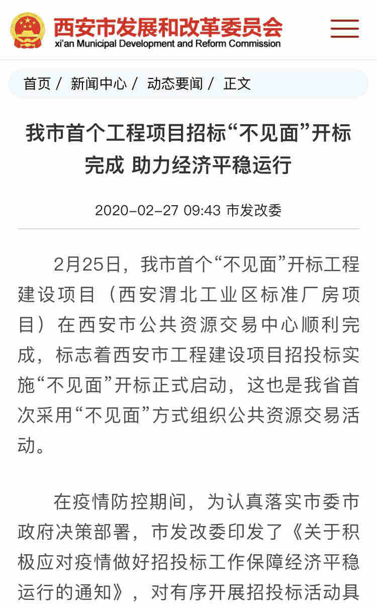 自抗擊疫情阻擊戰打響以來,我公司積極響應國家發改委《關于積極應對疫情創新做好招投標工作保障經濟平穩運行的通知》(發改電《2020》170號)、財政部《關于疫情防控期間開展政府采購活動有關事項的通知》(財辦庫《2020》29號)、市公共交易中心《疫情防控期間政府采購項目“不見面”開標工作辦法》等有關通知。公司全員一致高度重視,并在各級政府的關心和大力支持下,我司積極探索、主動承擔起了西安市首例電子化“不見面”開標模式,為了確保本次招標項目順利進行,我司領導與招標人、監管部門及市公共資源交易中心進行了深入的探討和溝通,并進行了多次模擬演練,于2020年2月25日上午在西安市公共資源交易中心順利實施了全過程電子化“不見面,在線視頻直播”的方式,對《臨潼渭北工業區標準工業廠房設計施工總承包》工程項目進行了公開招標(后附西安新聞網及發改委等有關官方報道)。